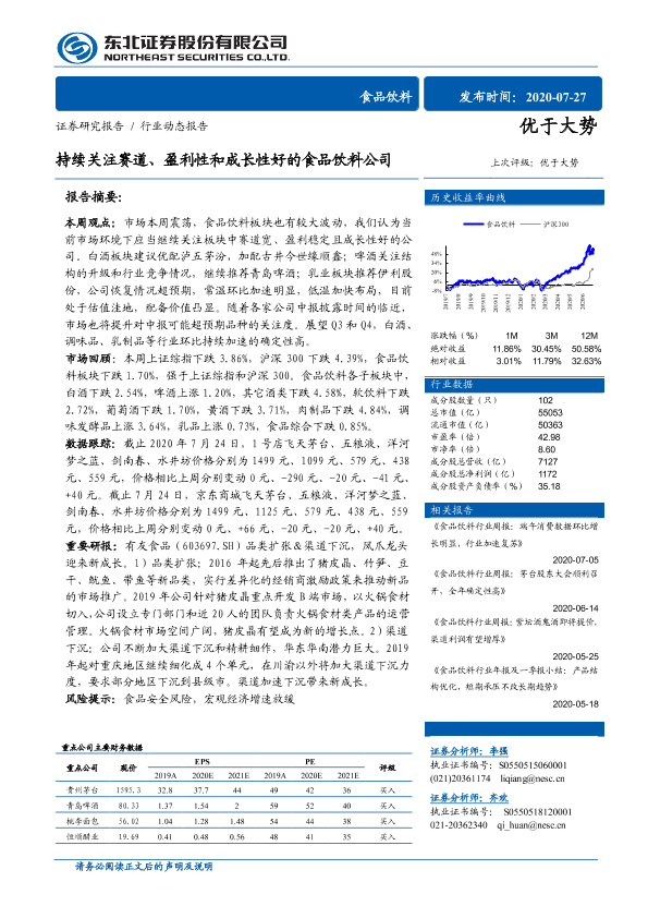 【东北证券】【20200727】20200727-东北证券-食品饮料行业动态报告:持续关注赛道、盈利性和成长性好的食品饮料公司-13页