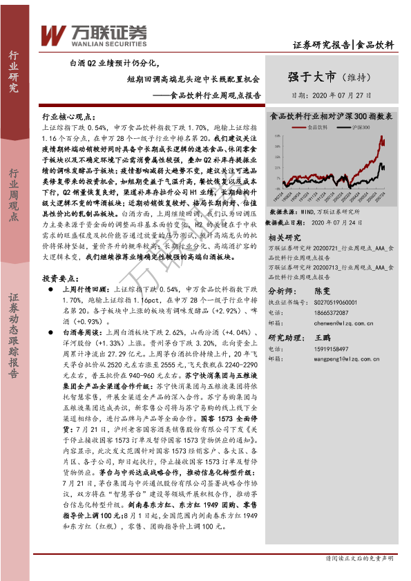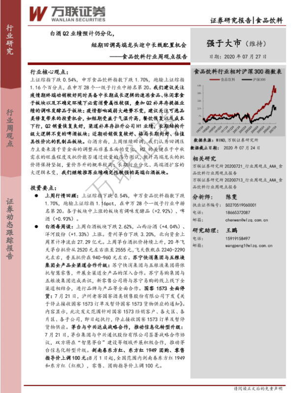 【万联证券】【20200727】20200727-万联证券-食品饮料行业周观点报告:白酒Q2业绩预计仍分化,短期回调高端龙头迎中长线配置机会-11页