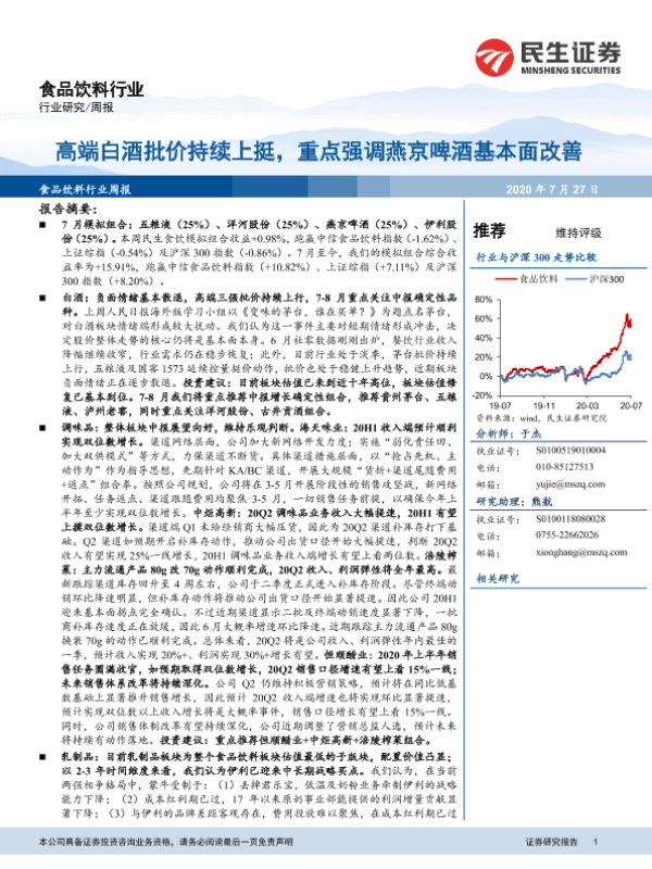 【民生证券】【20200727】20200727-民生证券-食品饮料行业周报:高端白酒批价持续上挺,重点强调燕京啤酒基本面改善-30页