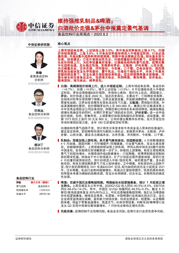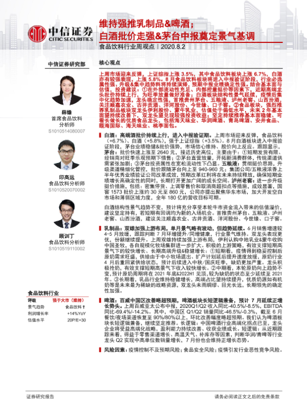 【中信证券】【20200802】20200802-中信证券-食品饮料行业周观点:维持强推乳制品&啤酒;白酒批价走强&茅台中报奠定景气基调-12页