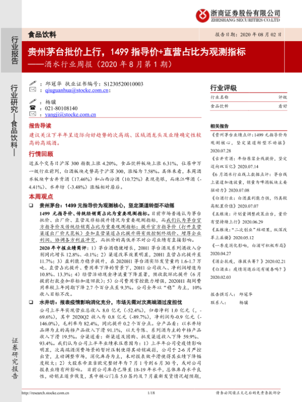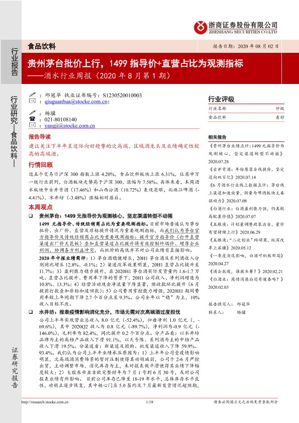 【浙商证券】【20200802】酒水行业周报(2020年8月第1期):贵州茅台批价上行,1499指导价+直营占比为观测指标-18页