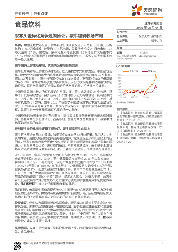 【天风证券】【20200804】食品饮料行业点评:双寡头差异化竞争逻辑验证,蒙牛加码牧场布局-2页