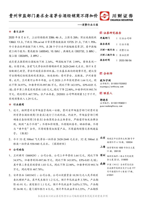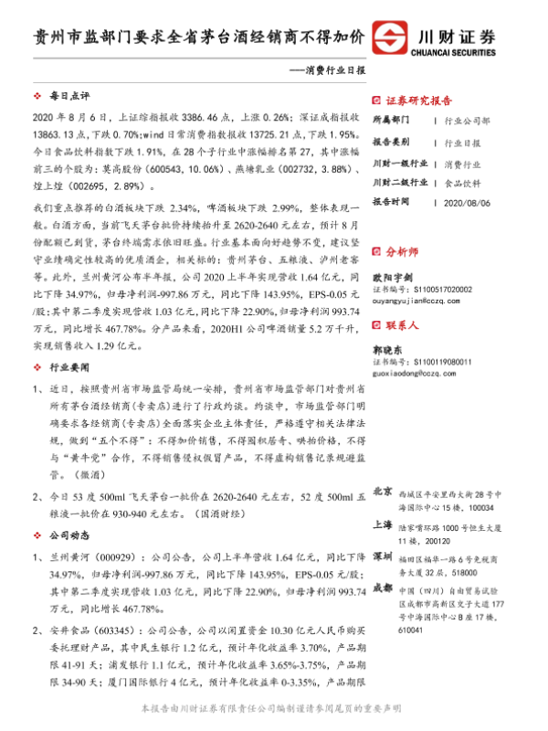 【川财证券】【20200806】消费行业日报:贵州市监部门要求全省茅台酒经销商不得加价-3页