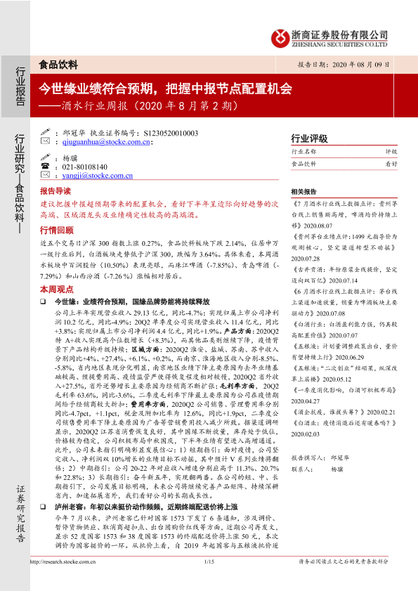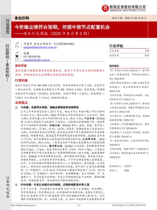 【浙商证券】【20200809】20200809-浙商证券-酒水行业周报(2020年8月第2期):今世缘业绩符合预期,把握中报节点配置机会-15页
