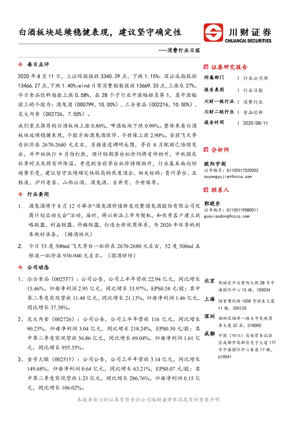 【川财证券】【20200811】消费行业日报:白酒板块延续稳健表现,建议坚守确定性-3页