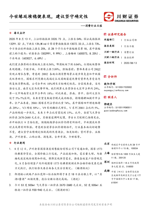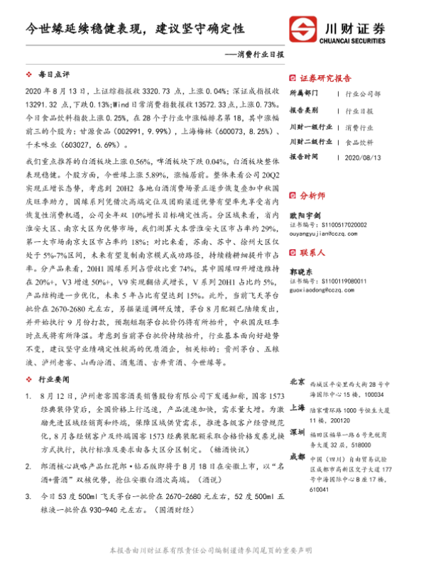【川财证券】【20200813】消费行业日报:今世缘延续稳健表现,建议坚守确定性-3页