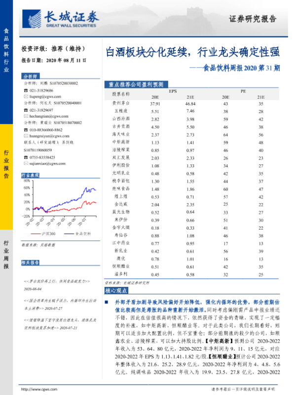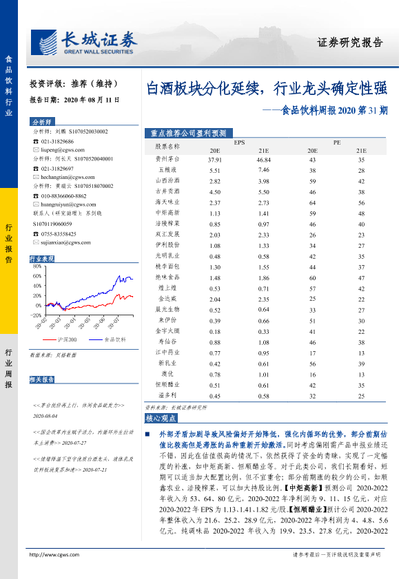 【长城证券】【20200811】食品饮料周报2020第31期:白酒板块分化延续,行业龙头确定性强-15页
