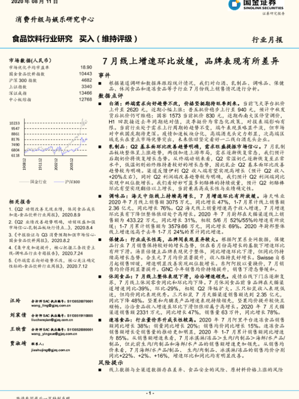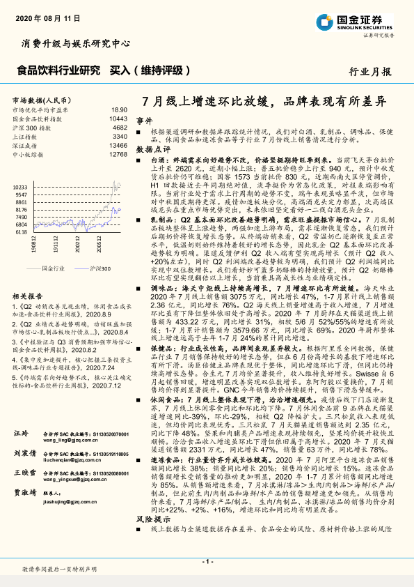 【国金证券】【20200811】20200811-国金证券-食品饮料行业研究:7月线上增速环比放缓,品牌表现有所差异-21页