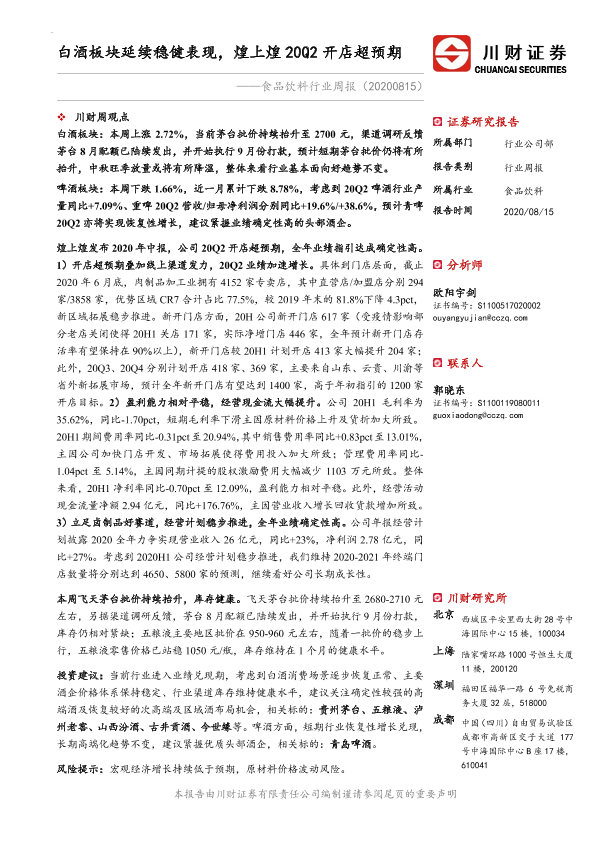【川财证券】【20200815】20200815-川财证券-食品饮料行业周报:白酒板块延续稳健表现,煌上煌20Q2开店超预期-13页