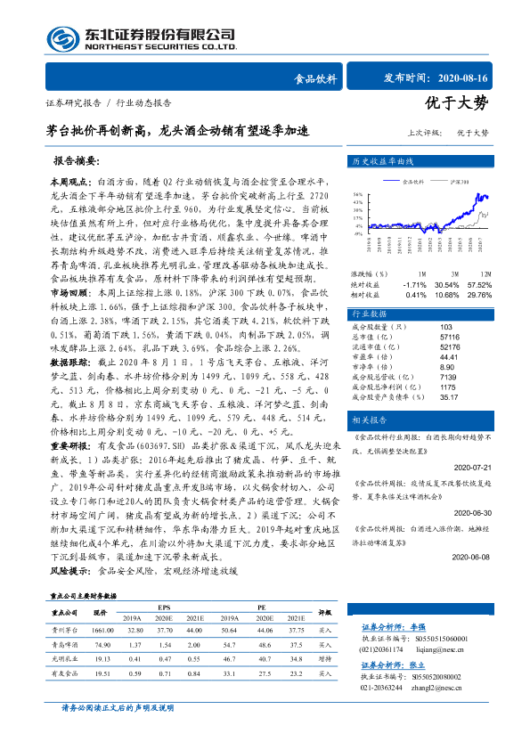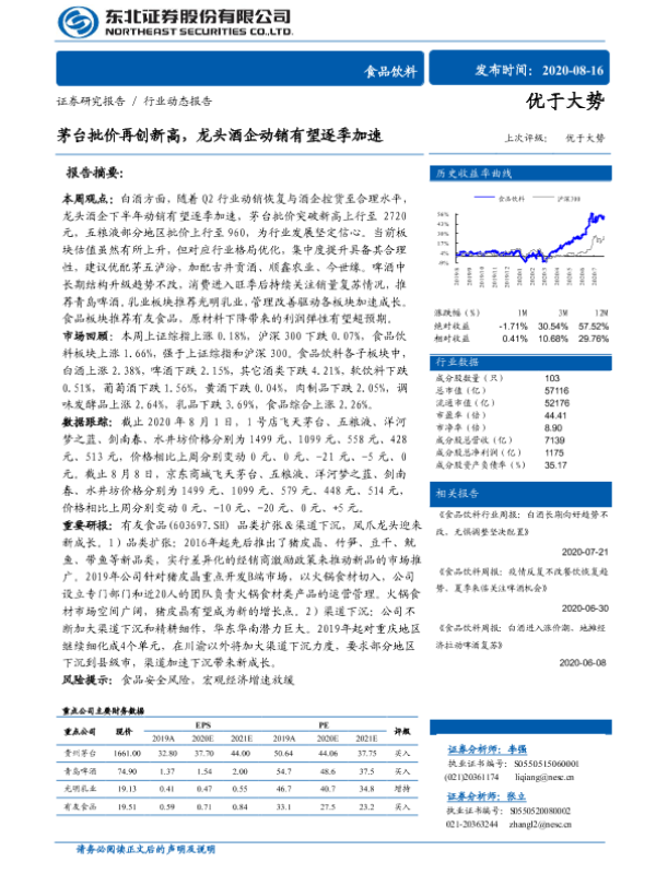 【东北证券】【20200816】20200816-东北证券-食品饮料行业动态报告:茅台批价再创新高,龙头酒企动销有望逐季加速-12页