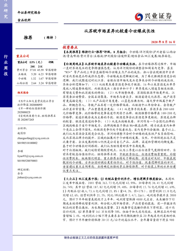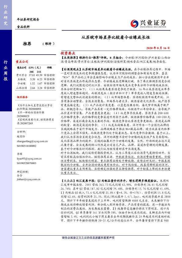 【兴业证券】【20200816】20200816-兴业证券-食品饮料行业周报:从苏皖市场差异比较看今世缘成长性-18页