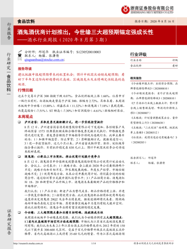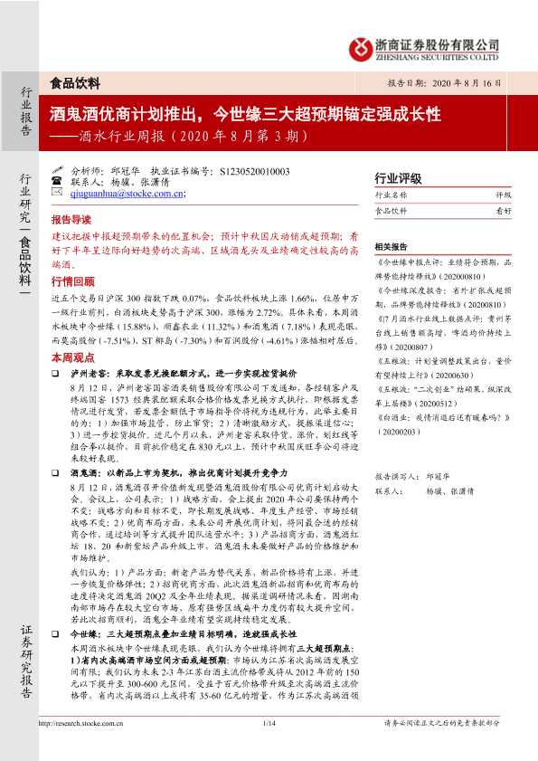 【浙商证券】【20200816】酒水行业周报(2020年8月第3期):酒鬼酒优商计划推出,今世缘三大超预期锚定强成长性-14页