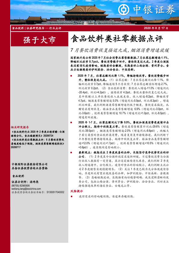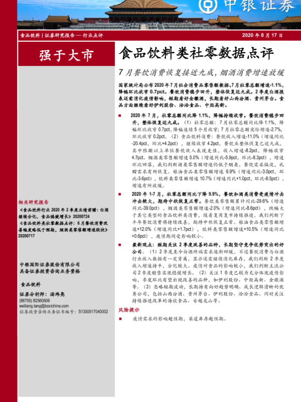 【中银证券】【20200817】食品饮料类社零数据点评:7月餐饮消费恢复接近九成,烟酒消费增速放缓-4页