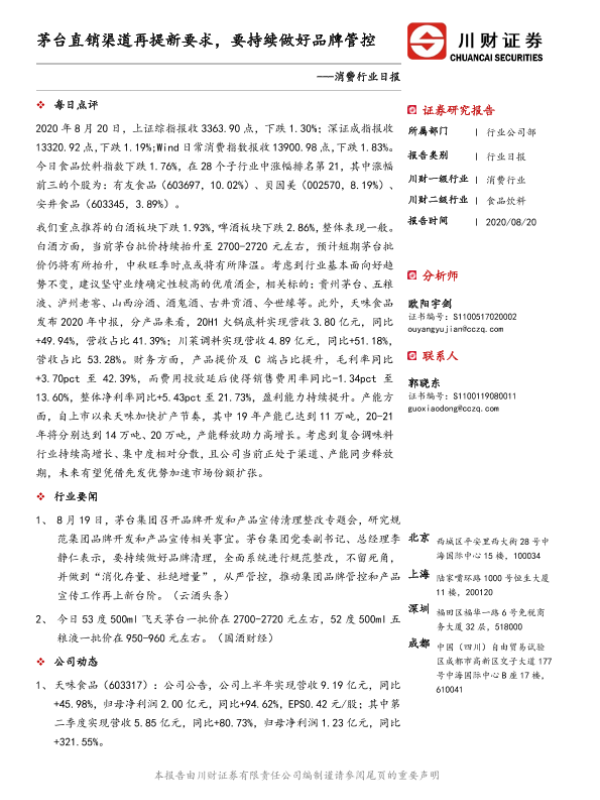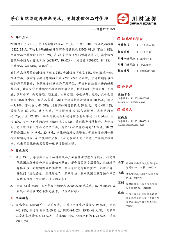 【川财证券】【20200820】消费行业日报:茅台直销渠道再提新要求,要持续做好品牌管控-4页