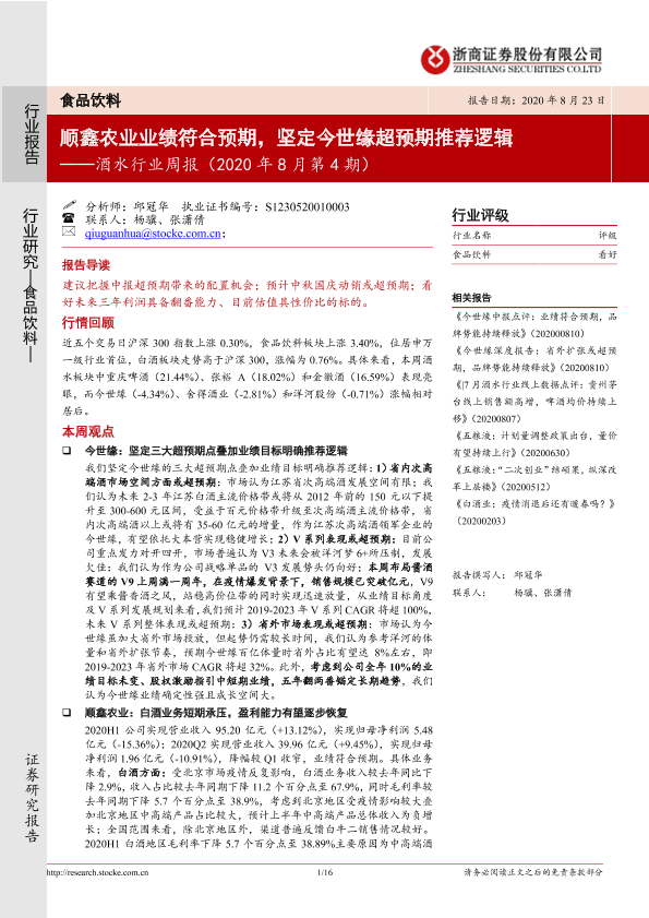 【浙商证券】【20200823】20200823-浙商证券-酒水行业周报(2020年8月第4期):顺鑫农业业绩符合预期,坚定今世缘超预期推荐逻辑-16页