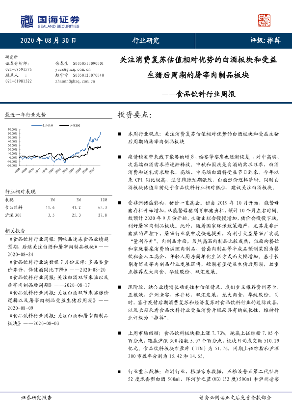 【国海证券】【20200830】食品饮料行业周报:关注消费复苏估值相对优势的白酒板块和受益生猪后周期的屠宰肉制品板块-22页