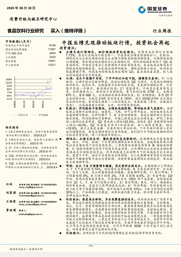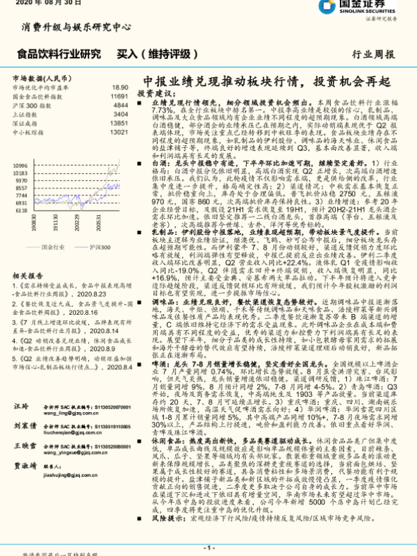 【国金证券】【20200830】20200830-国金证券-食品饮料行业研究:中报业绩兑现推动板块行情,投资机会再起-16页
