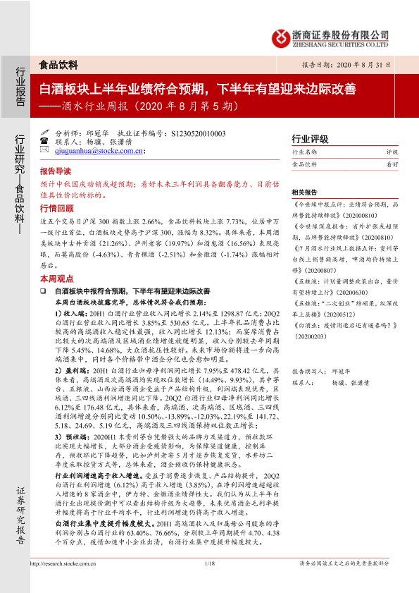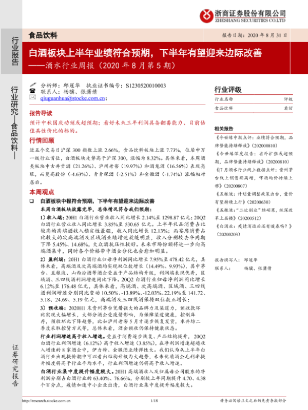 【浙商证券】【20200831】20200831-浙商证券-酒水行业周报(2020年8月第5期):白酒板块上半年业绩符合预期,下半年有望迎来边际改善-18页