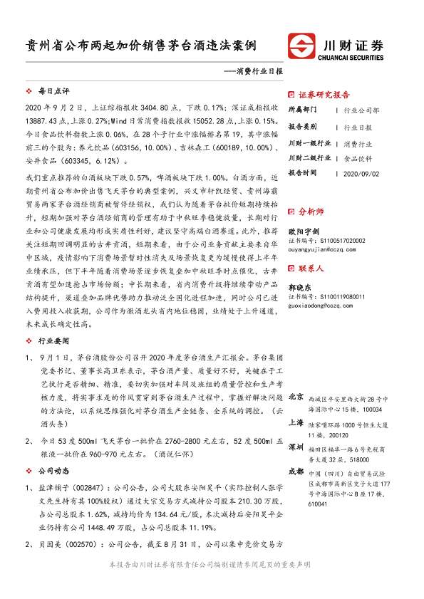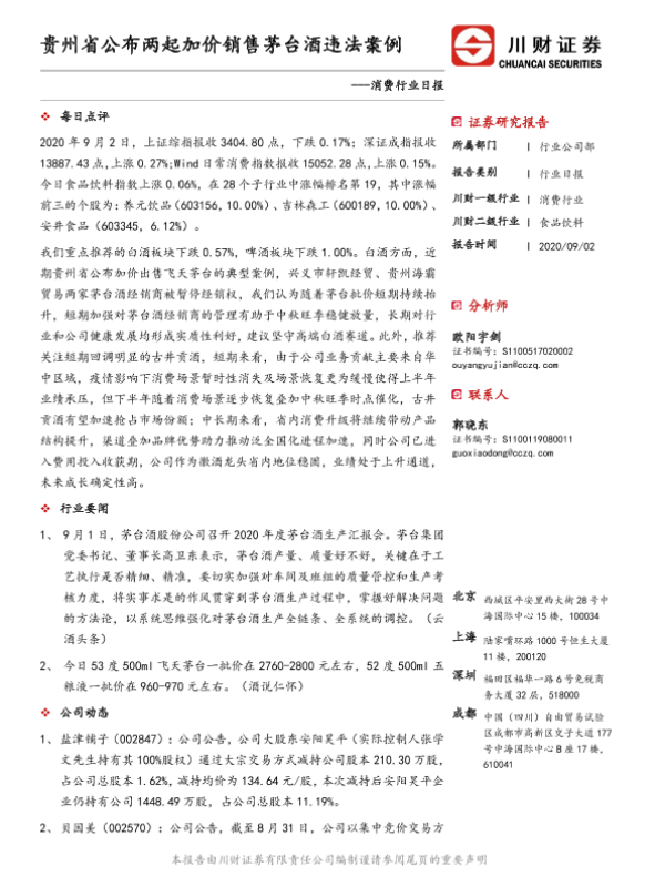 【川财证券】【20200902】消费行业日报:贵州省公布两起加价销售茅台酒违法案例-4页
