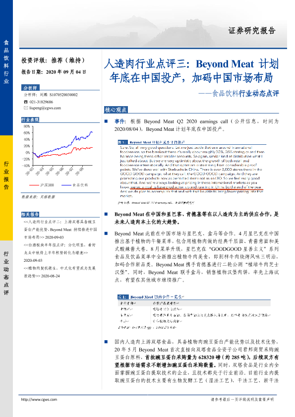 【长城证券】【20200904】食品饮料行业动态点评:人造肉行业点评三:Beyond Meat计划年底在中国投产,加码中国市场布局-3页