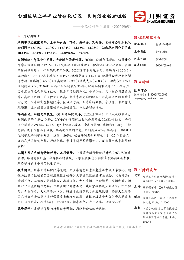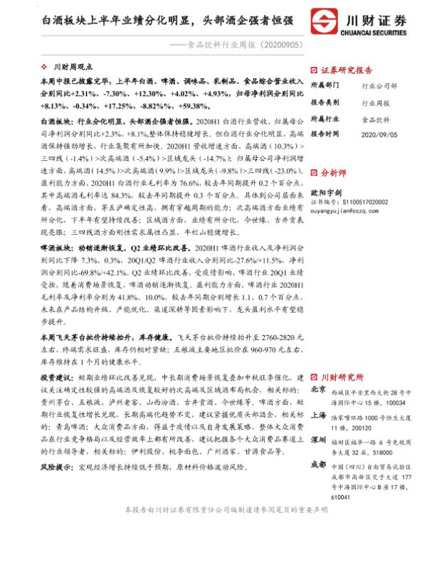 【川财证券】【20200905】食品饮料行业周报:白酒板块上半年业绩分化明显,头部酒企强者恒强-13页