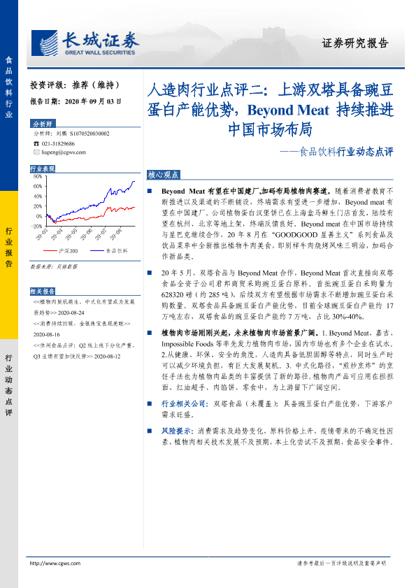 【长城证券】【20200903】食品饮料行业动态点评:人造肉行业点评二:上游双塔具备豌豆蛋白产能优势,Beyond Meat持续推进中国市场布局-2页