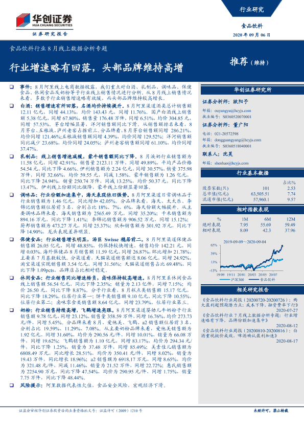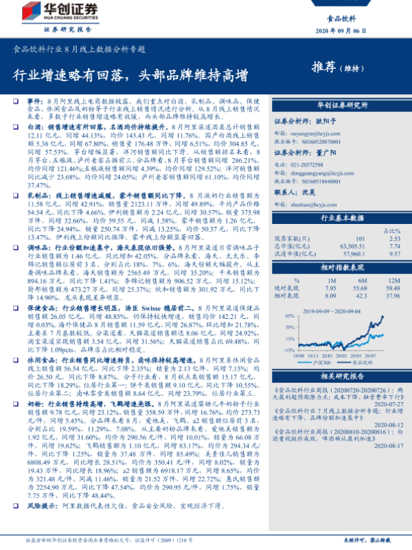 【华创证券】【20200906】食品饮料行业8月线上数据分析专题:行业增速略有回落,头部品牌维持高增-20页