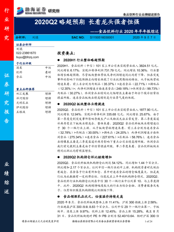 【渤海证券】【20200907】食品饮料行业2020年半年报综述:2020Q2略超预期 长看龙头强者恒强-24页