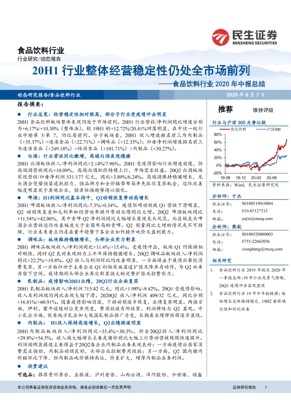 【民生证券】【20200907】食品饮料行业2020年中报总结:20H1行业整体经营稳定性仍处全市场前列-42页