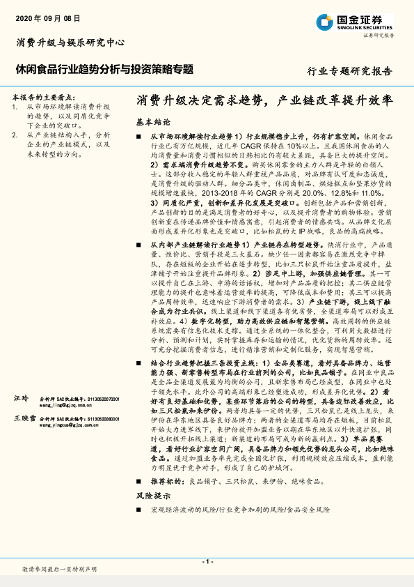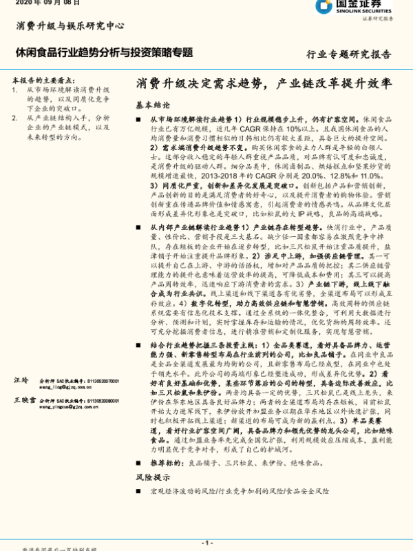 【国金证券】【20200908】20200908-国金证券-休闲食品行业趋势分析与投资策略专题:消费升级决定需求趋势,产业链改革提升效率-21页