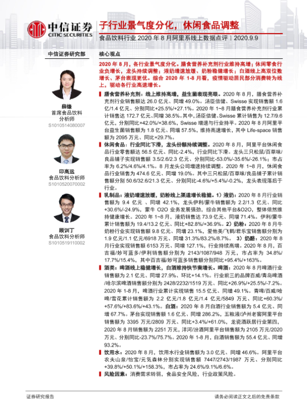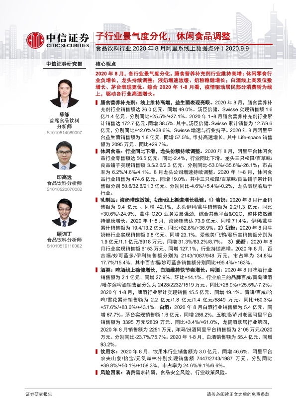 【中信证券】【20200909】食品饮料行业2020年8月阿里系线上数据点评:子行业景气度分化,休闲食品调整-10页