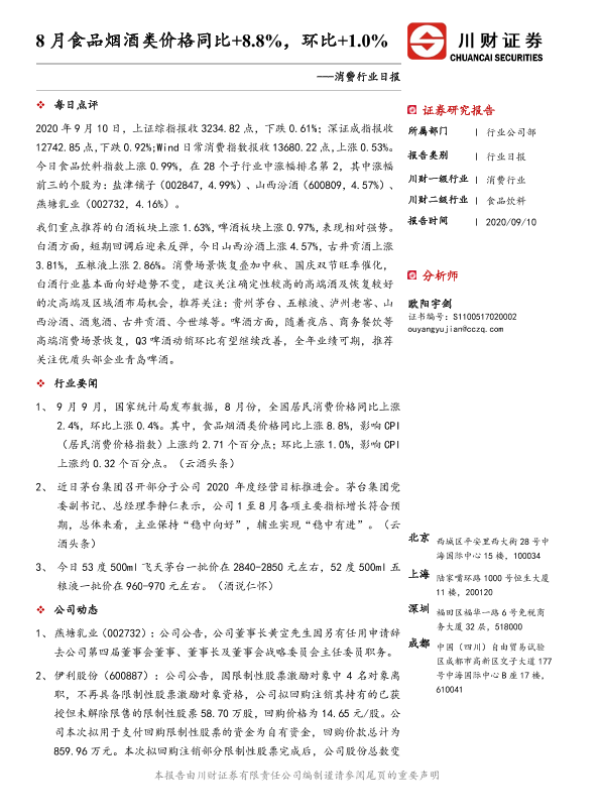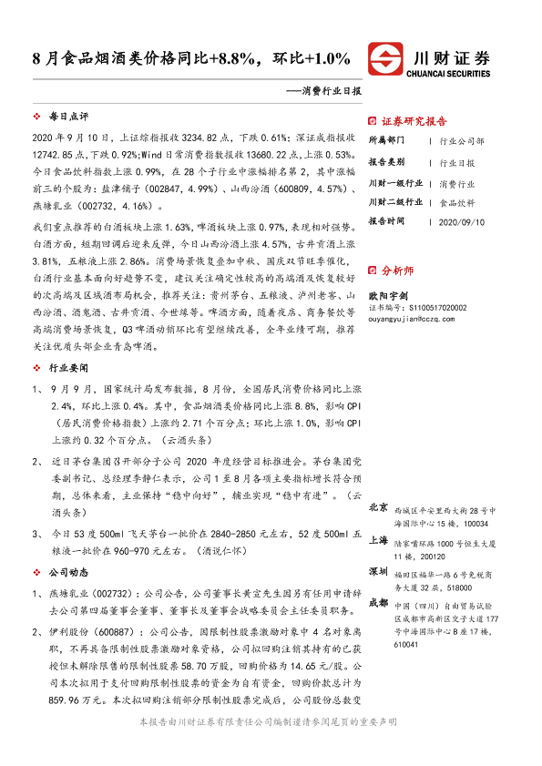 【川财证券】【20200910】消费行业日报:8月食品烟酒类价格同比+8.8%,环比+1.0%-3页