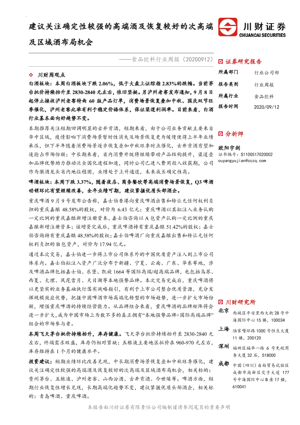 【川财证券】【20200912】食品饮料行业周报:建议关注确定性较强的高端酒及恢复较好的次高端及区域酒布局机会-13页