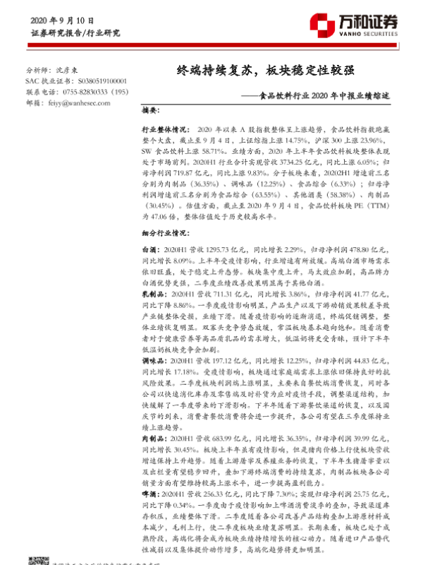 【万和证券】【20200910】食品饮料行业2020年中报业绩综述:终端持续复苏,板块稳定性较强-19页