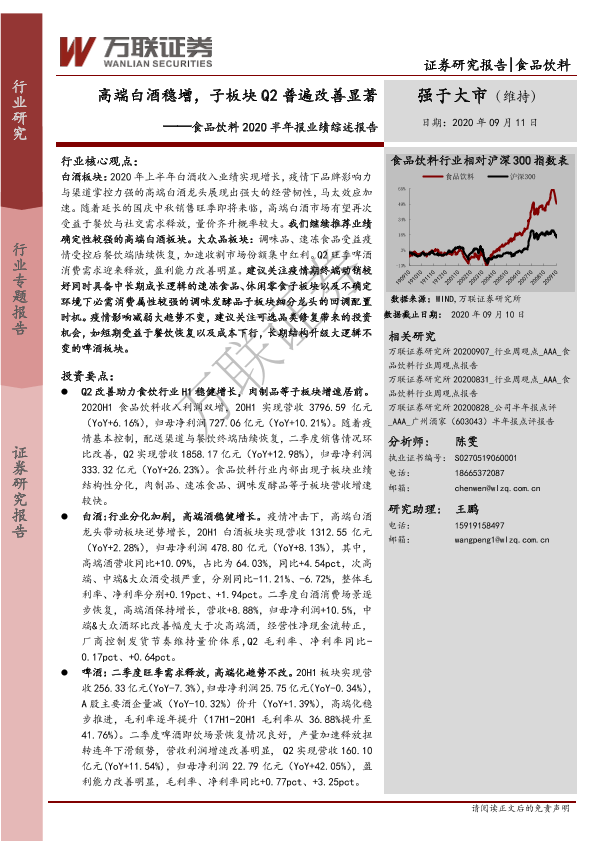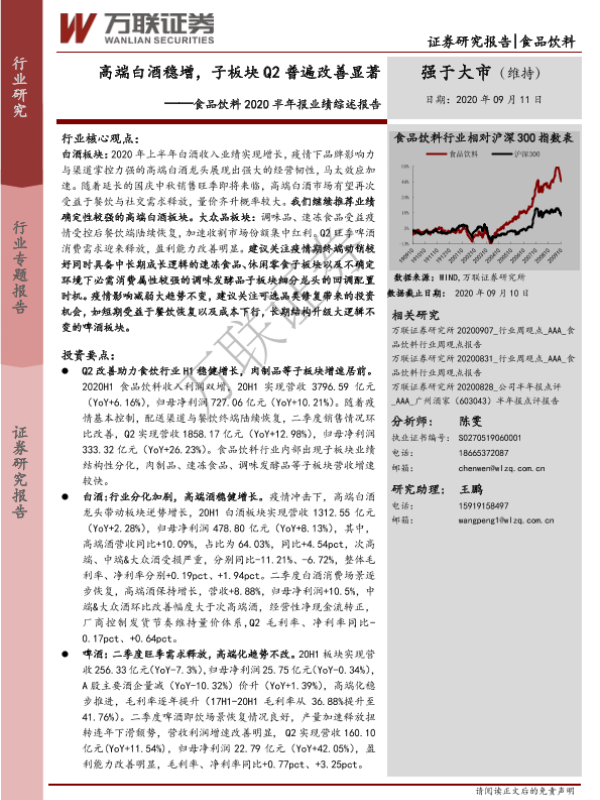 【万联证券】【20200911】食品饮料2020半年报业绩综述报告:高端白酒稳增,子板块Q2普遍改善显著-23页