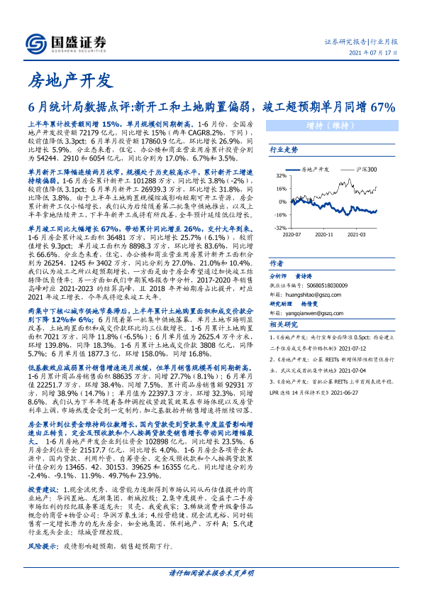 【国盛证券】【20210717】房地产开发行业6月统计局数据点评:新开工和土地购置偏弱,竣工超预期单月同增67%-13页