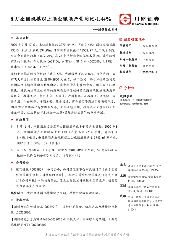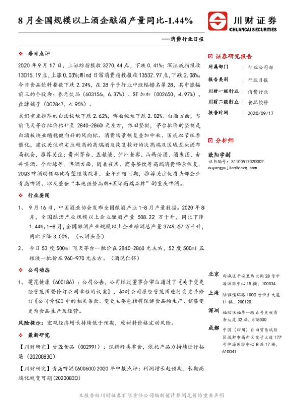 【川财证券】【20200917】8月全国规模以上酒企酿酒产量同比-1.44%-3页