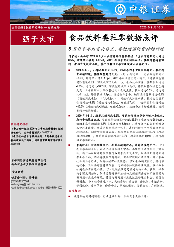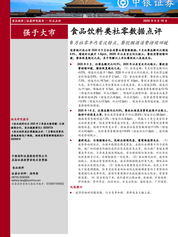 【中银证券】【20200916】食品饮料类社零数据点评:8月社零年内首次转正,餐饮烟酒消费持续回暖-5页
