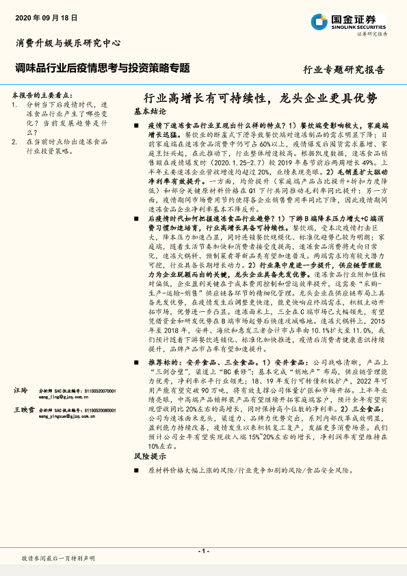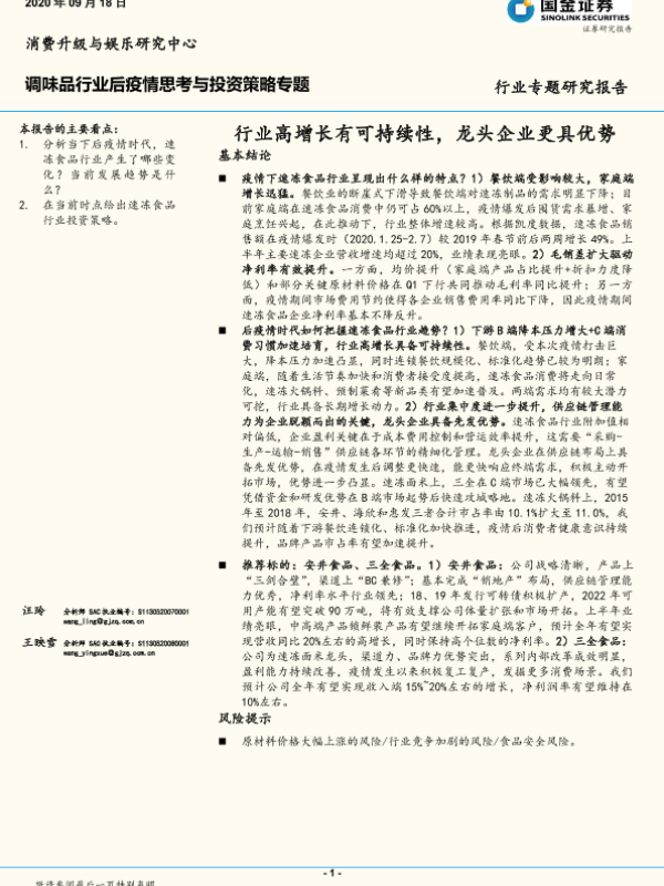 【国金证券】【20200918】调味品行业后疫情思考与投资策略专题:行业高增长有可持续性,龙头企业更具优势-19页