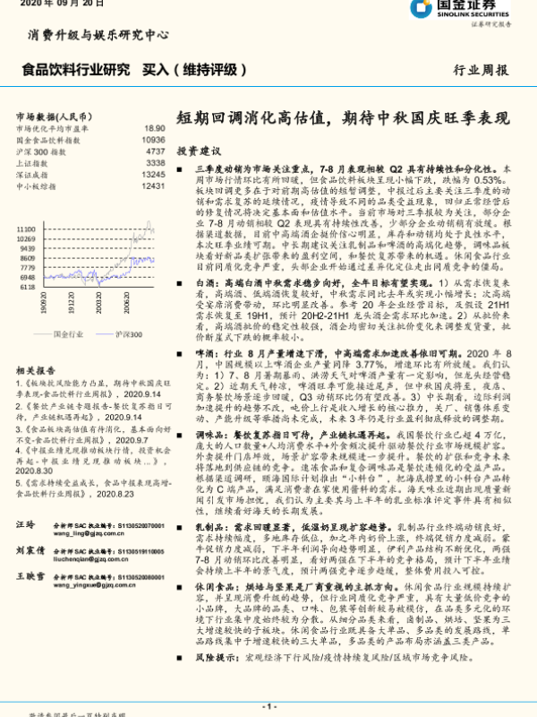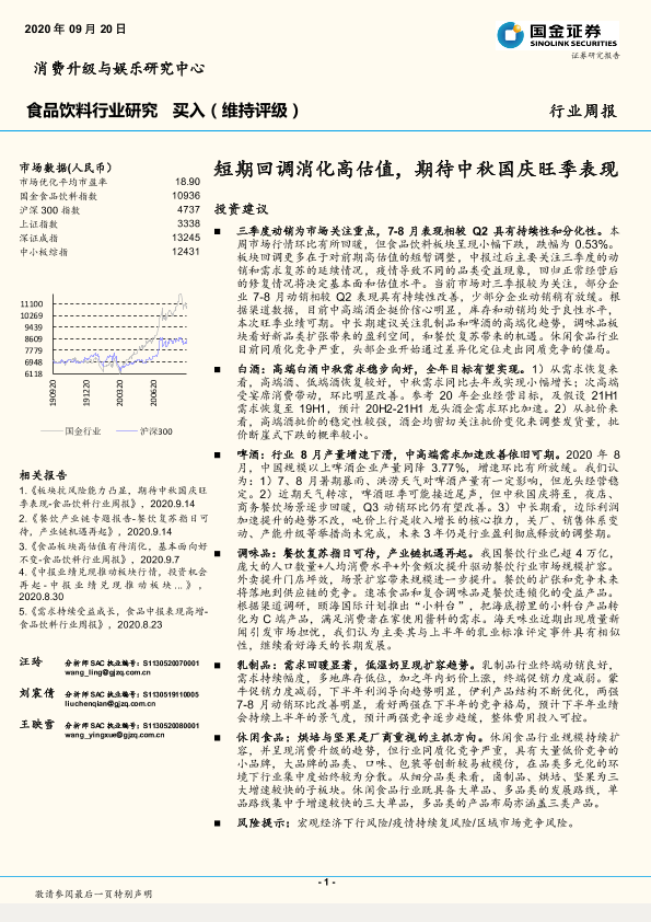 【国金证券】【20200920】20200920-国金证券-食品饮料行业周报:短期回调消化高估值,期待中秋国庆旺季表现-14页