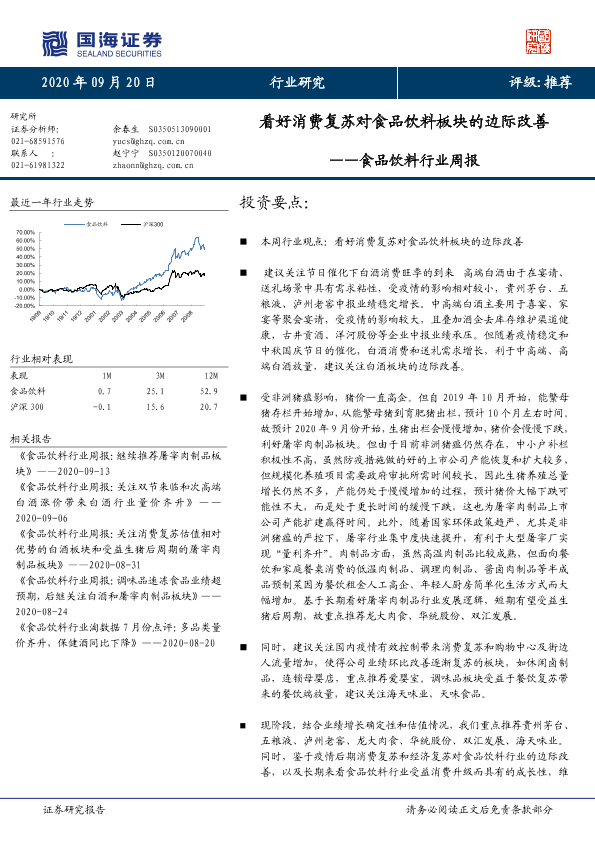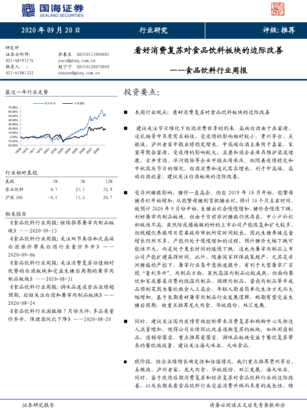 【国海证券】【20200920】食品饮料行业周报:看好消费复苏对食品饮料板块的边际改善-20页