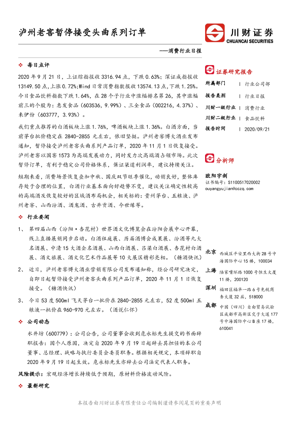 【川财证券】【20200921】消费行业日报:泸州老窖暂停接受头曲系列订单-3页