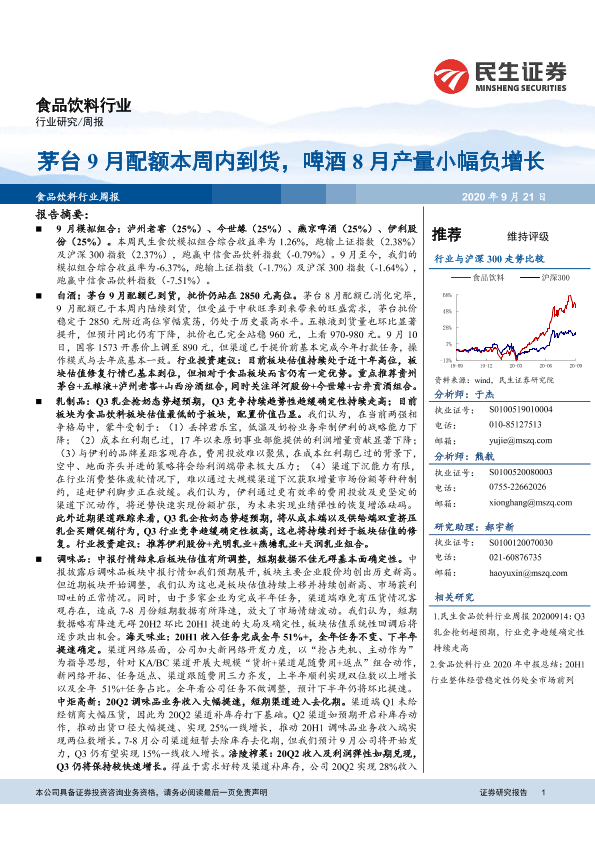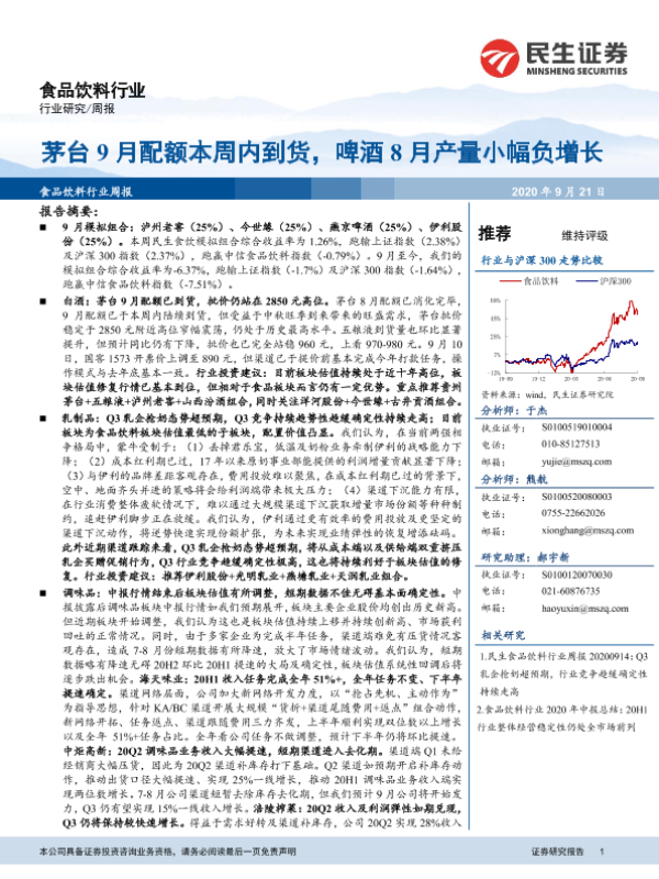 【民生证券】【20200921】20200921-民生证券-食品饮料行业周报:茅台9月配额本周内到货,啤酒8月产量小幅负增长-26页