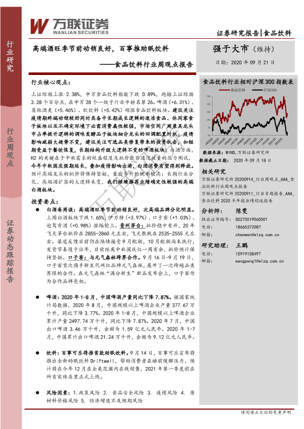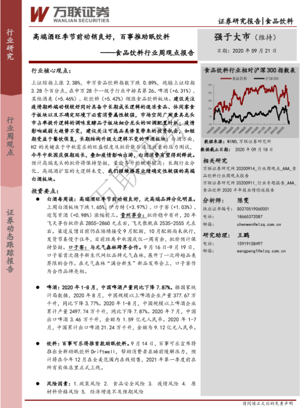 【万联证券】【20200921】20200921-万联证券-食品饮料行业周观点报告:高端酒旺季节前动销良好,百事推助眠饮料-9页