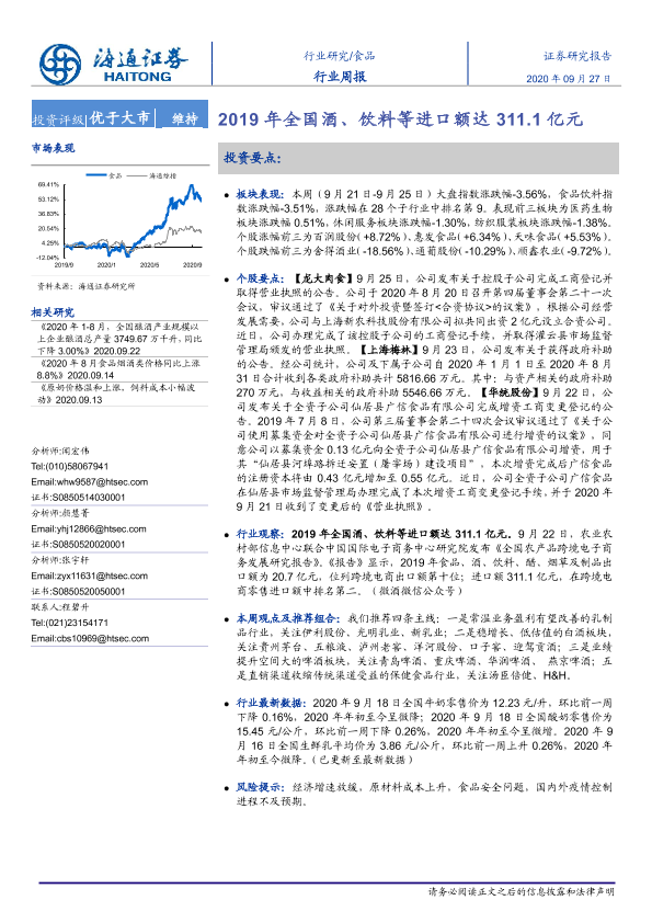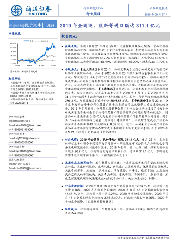 【海通证券】【20200927】20200927-海通证券-食品饮料行业周报:2019年全国酒、饮料等进口额达311.1亿元-7页