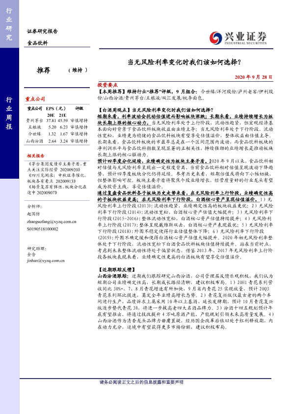 【兴业证券】【20200928】20200928-兴业证券-食品饮料行业周报:当无风险利率变化时我们该如何选择?-16页