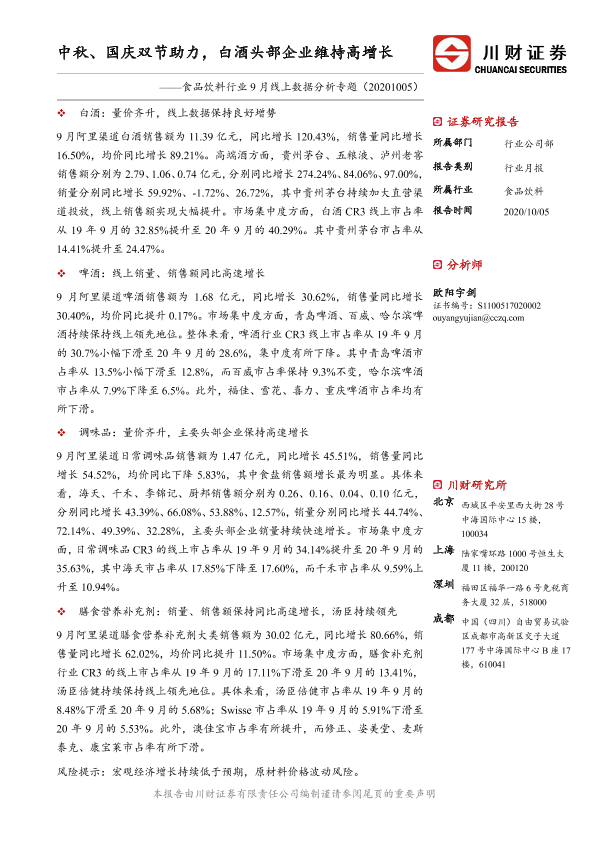 【川财证券】【20201005】食品饮料行业9月线上数据分析专题:中秋、国庆双节助力,白酒头部企业维持高增长-18页