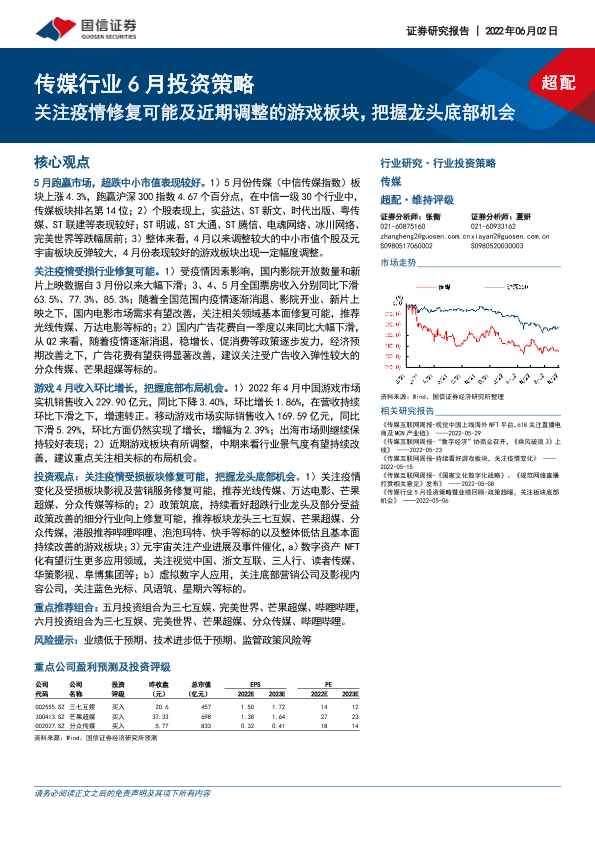 【国信证券】【20220602】传媒行业6月投资策略:关注疫情修复可能及近期调整的游戏板块,把握龙头底部机会-16页