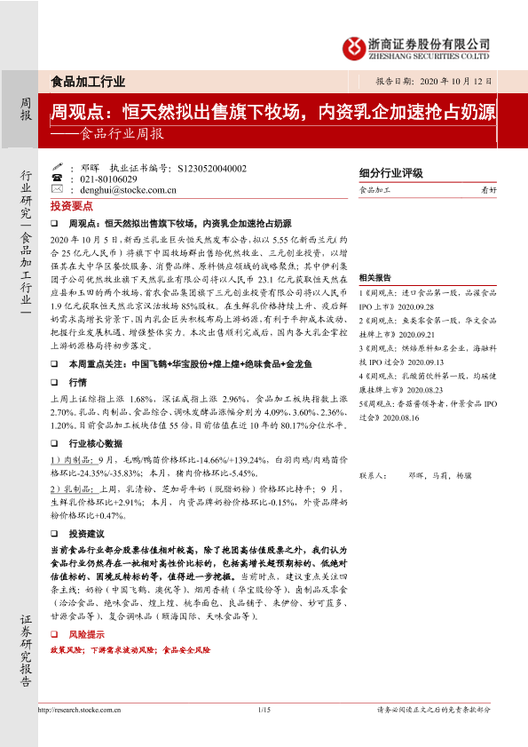 【浙商证券】【20201012】20201012-浙商证券-食品行业周报:恒天然拟出售旗下牧场,内资乳企加速抢占奶源-15页
