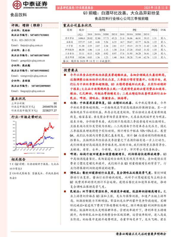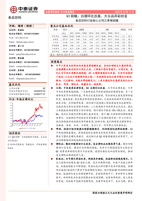 【中泰证券】【20201011】食品饮料Q3前瞻:白酒环比改善,大众品异彩纷呈 食品饮料行业核心公司三季报前瞻-17页